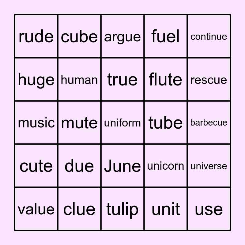 This bingo card has a free space and 24 words: due, clue, true, value, continue, rude, huge, cube, tube, June, flute, music, unicorn, universe, human, unit, barbecue, argue, rescue, mute, use, cute, fuel and tulip.