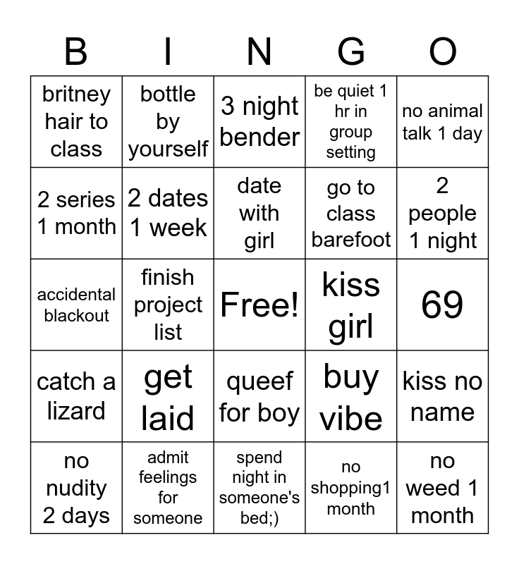 This bingo card has a free space and 24 words: get laid, admit feelings for someone, date with girl, no nudity 2 days, no animal talk 1 day, britney hair to class, 2 series 1 month, bottle by yourself, kiss girl, queef for boy, go to class barefoot, accidental blackout, buy vibe, kiss no name, 2 dates 1 week, no shopping1 month, 69, 3 night bender, 2 people 1 night, finish project list, no weed 1 month, catch a lizard, be quiet 1 hr in group setting and spend night in someone's bed;).