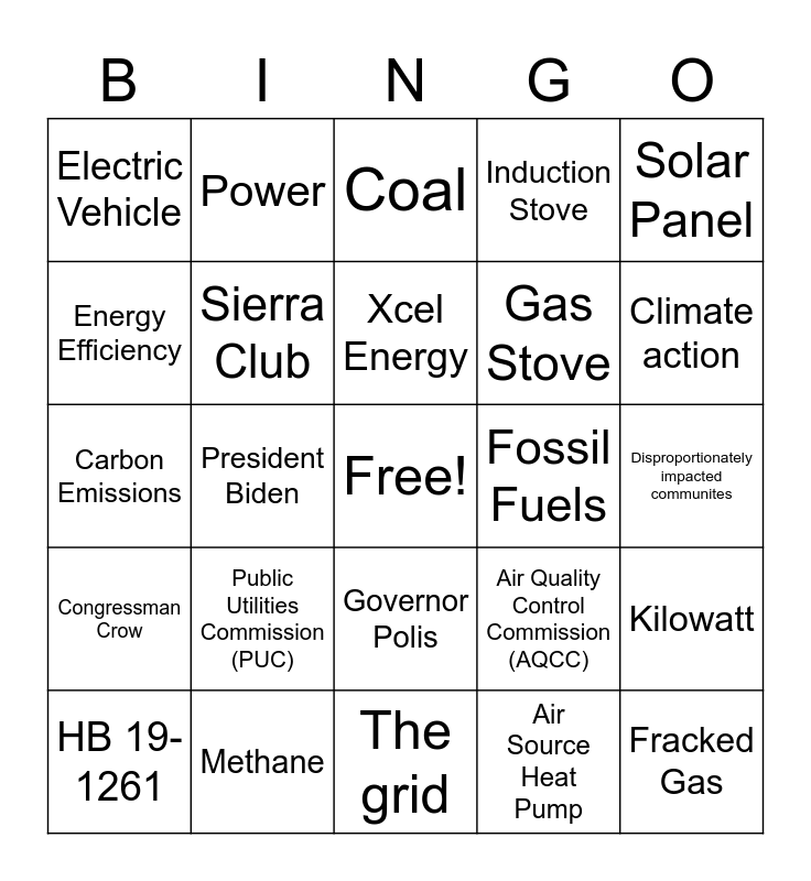 This bingo card has a free space and 32 words: Air Source Heat Pump, Ground Source Heat Pump, President Biden, Clean Renewable Energy, Congressman Crow, Sierra Club, Solar Panel, Kilowatt, Power, BTU, Xcel Energy, Coal, Building Electrification, Just Transition, Fossil Fuels, Greenhouse Gas Emissions, HB 19-1261, Carbon Emissions, Governor Polis, Public Utilities Commission (PUC), Air Quality Control Commission (AQCC), Front Line Communities, Disproportionately impacted communites, Methane, Fracked Gas, Induction Stove, Gas Stove, Energy Efficiency, Electric Vehicle, The grid, Indoor air quality and Climate action.