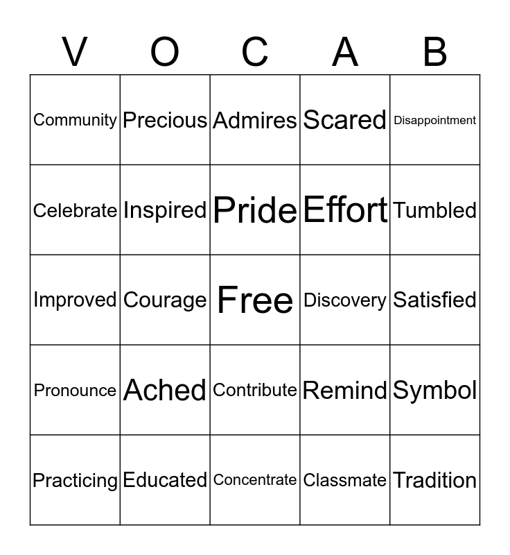 This bingo card has a free space and 24 words: Ached, Educated, Pride, Practicing, Disappointment, Community, Celebrate, Precious, Discovery, Contribute, Effort, Improved, Remind, Symbol, Inspired, Classmate, Satisfied, Admires, Tumbled, Courage, Tradition, Pronounce, Scared and Concentrate.