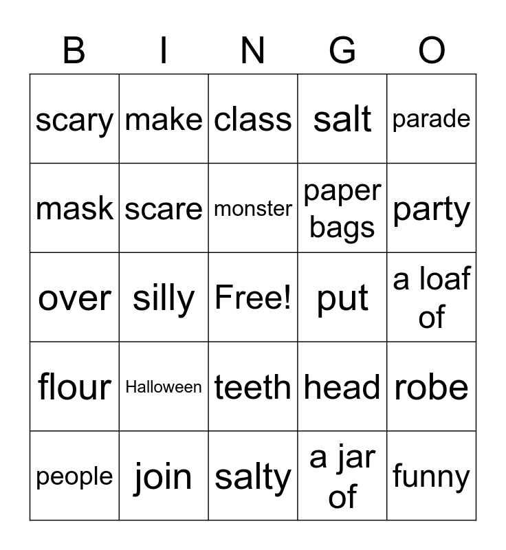 This bingo card has a free space and 24 words: Halloween, join, monster, people, parade, scary, mask, make, put, teeth, paper bags, over, head, robe, scare, a jar of, a loaf of, class, party, silly, funny, flour, salt and salty.