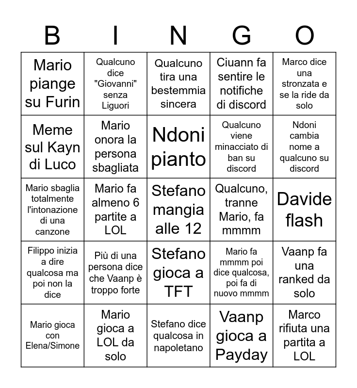 This bingo card has 25 words: Più di una persona dice che Vaanp è troppo forte, Stefano dice qualcosa in napoletano, Ndoni pianto, Mario gioca con Elena/Simone, Marco dice una stronzata e se la ride da solo, Mario piange su Furin, Meme sul Kayn di Luco, Qualcuno dice "Giovanni" senza Liguori, Qualcuno, tranne Mario, fa mmmm, Stefano gioca a TFT, Qualcuno viene minacciato di ban su discord, Mario sbaglia totalmente l'intonazione di una canzone, Mario fa mmmm poi dice qualcosa, poi fa di nuovo mmmm, Vaanp fa una ranked da solo, Mario onora la persona sbagliata, Marco rifiuta una partita a LOL, Davide flash, Qualcuno tira una bestemmia sincera, Ndoni cambia nome a qualcuno su discord, Mario fa almeno 6 partite a LOL, Stefano mangia alle 12, Mario gioca a LOL da solo, Filippo inizia a dire qualcosa ma poi non la dice, Ciuann fa sentire le notifiche di discord and Vaanp gioca a Payday.