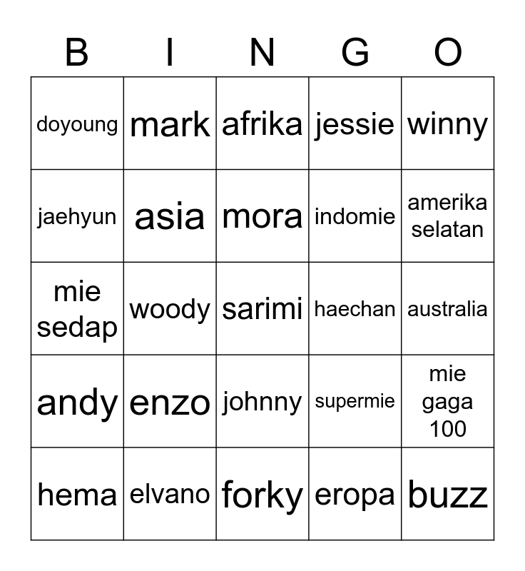 This bingo card has a free space and 24 words: enzo, elvano, mora, hema, winny, doyoung, jaehyun, mark, haechan, johnny, indomie, mie sedap, supermie, mie gaga 100, asia, eropa, australia, afrika, amerika selatan, woody, buzz, andy, jessie and forky.
