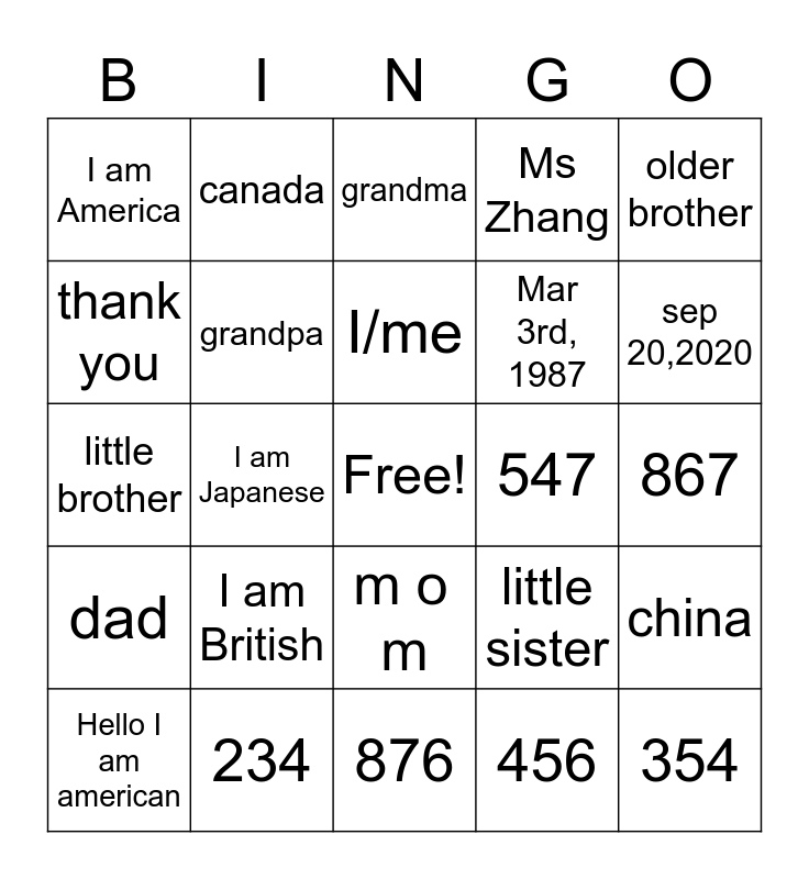 This bingo card has a free space and 29 words: Hello I am american, Goodbye, I am Japanese, Which country are you from, I am America, grandma, grandpa, I am British, 547, 234, 867, 354, 876, 456, sep 20,2020, October 5, 1677, mom, dad, older brother, little brother, little sister, older sister, Mar 3rd, 1987, thank you, Ms Zhang, canada, china, I/me and is am are.