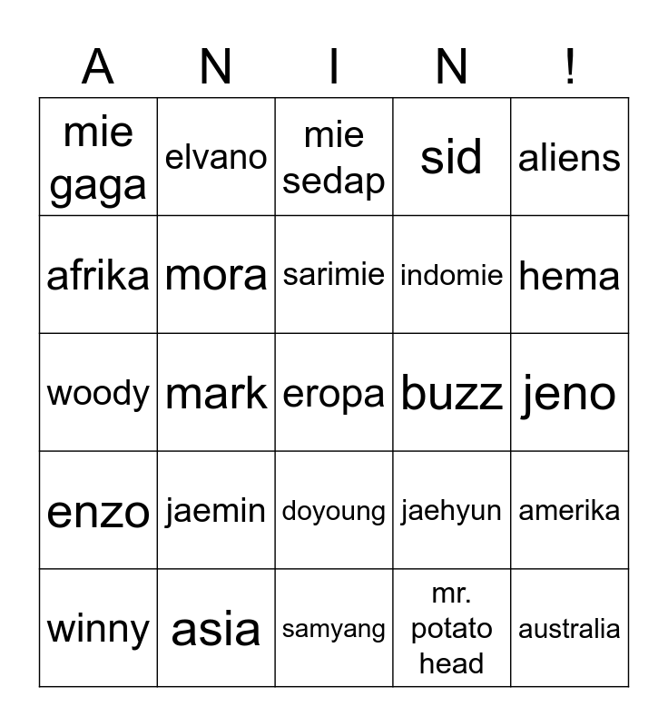 This bingo card has a free space and 24 words: jaemin, asia, sarimie, winny, aliens, mie gaga, afrika, elvano, buzz, doyoung, indomie, woody, jaehyun, amerika, mora, mr. potato head, jeno, mie sedap, hema, mark, australia, enzo, sid and samyang.