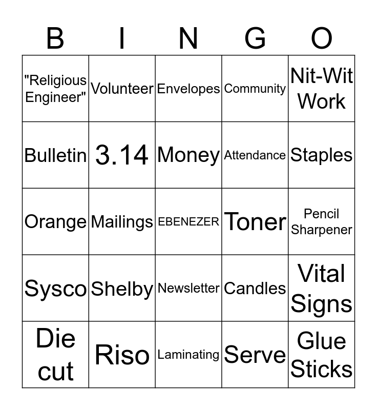 This bingo card has a free space and 24 words: Shelby, Riso, Money, Die cut, Nit-Wit Work, "Religious Engineer", Bulletin, Volunteer, Toner, Newsletter, Attendance, Orange, Candles, Vital Signs, 3.14, Serve, Pencil Sharpener, Envelopes, Staples, Mailings, Glue Sticks, Sysco, Community and Laminating.