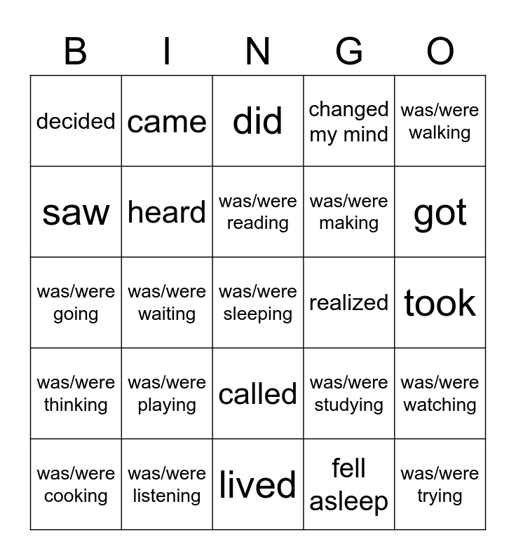 This bingo card has a free space and 24 words: was/were playing, was/were listening, was/were reading, was/were cooking, was/were walking, decided, saw, came, realized, called, was/were making, was/were going, was/were studying, was/were watching, heard, fell asleep, took, did, got, was/were waiting, was/were trying, was/were thinking, changed my mind and lived.