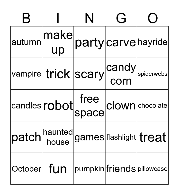 This bingo card has a free space and 24 words: haunted house, fun, scary, October, hayride, autumn, vampire, make up, clown, games, candy corn, candles, flashlight, treat, trick, friends, chocolate, party, spiderwebs, robot, pillowcase, patch, carve and pumpkin.