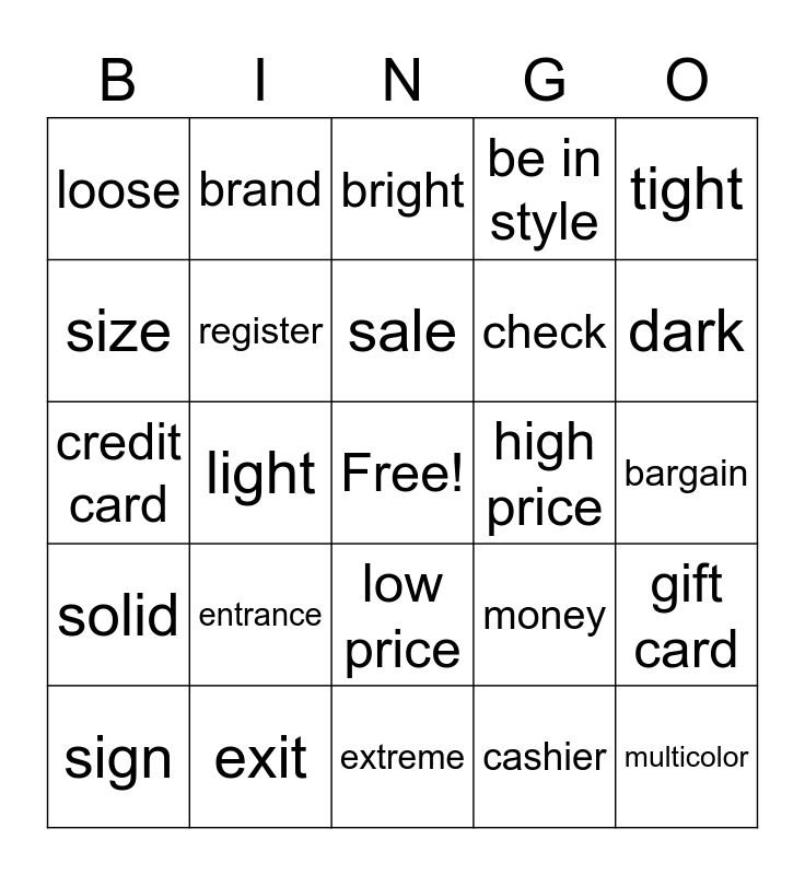 This bingo card has a free space and 24 words: entrance, exit, sale, sign, tight, loose, size, brand, high price, low price, check, credit card, money, gift card, register, cashier, bargain, bright, dark, light, multicolor, solid, be in style and extreme.