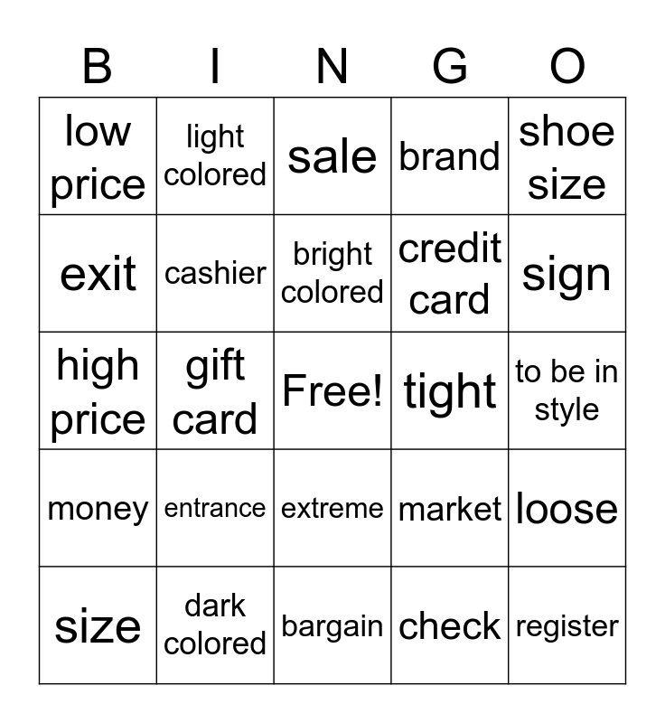 This bingo card has a free space and 24 words: entrance, dark colored, bright colored, size, shoe size, low price, exit, light colored, tight, extreme, credit card, high price, market, loose, cashier, check, to be in style, sale, sign, gift card, register, money, brand and bargain.