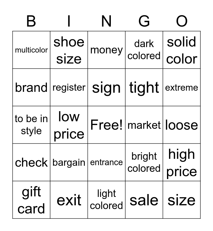 This bingo card has a free space and 26 words: entrance, sale, sign, exit, solid color, multicolor, brand, shoe size, loose, bright colored, tight, to be in style, high price, gift card, low price, credit card, dark colored, check, money, size, extreme, light colored, market, bargain, register and cashier.