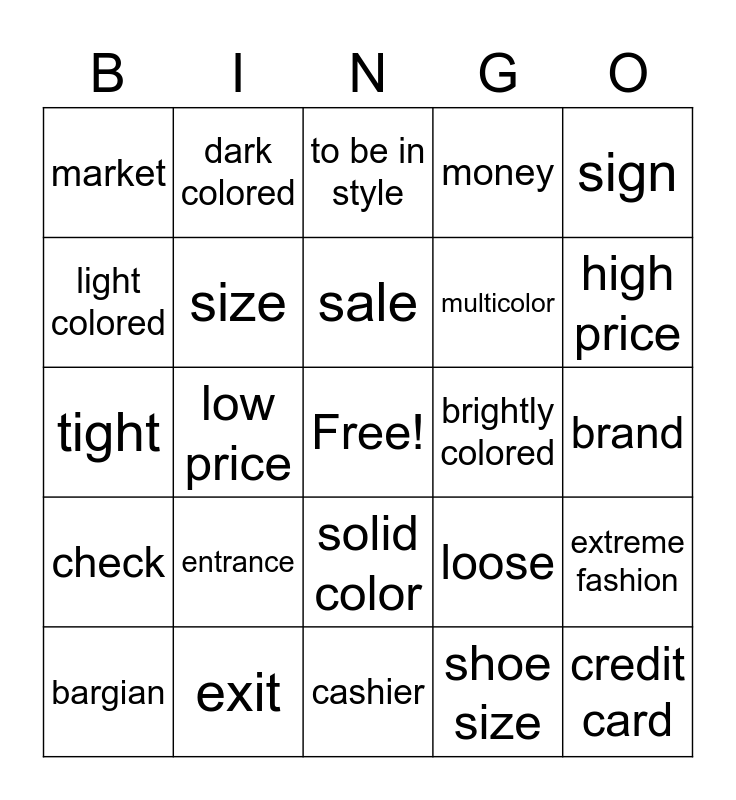 This bingo card has a free space and 24 words: entrance, exit, sale, bargian, sign, market, light colored, dark colored, brightly colored, solid color, multicolor, tight, loose, extreme fashion, size, shoe size, brand, to be in style, high price, low price, credit card, check, money and cashier.
