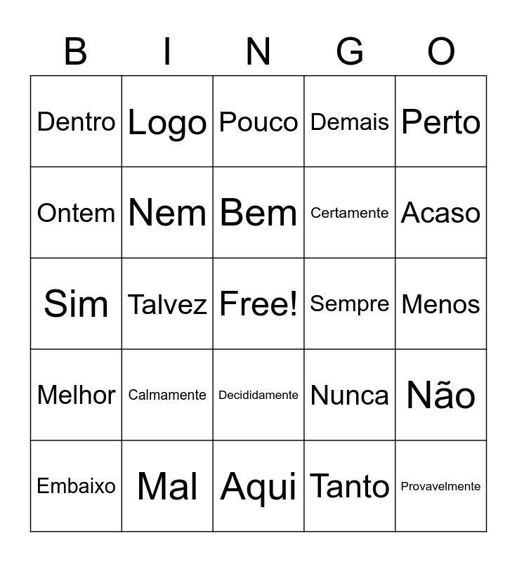 This bingo card has a free space and 24 words: Calmamente, Mal, Bem, Embaixo, Perto, Dentro, Ontem, Logo, Sempre, Decididamente, Certamente, Sim, Nunca, Não, Nem, Tanto, Menos, Pouco, Acaso, Talvez, Provavelmente, Melhor, Demais and Aqui.