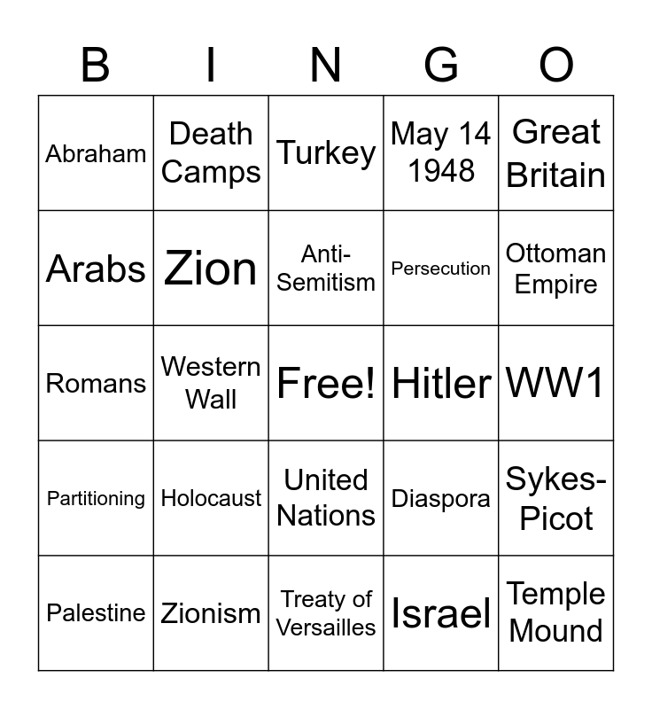 This bingo card has a free space and 24 words: Holocaust, Zionism, Anti-Semitism, Palestine, Great Britain, Abraham, Arabs, Death Camps, Hitler, United Nations, Persecution, Romans, Diaspora, Sykes-Picot, Zion, Israel, WW1, Turkey, Ottoman Empire, Western Wall, Temple Mound, Partitioning, May 14 1948 and Treaty of Versailles.