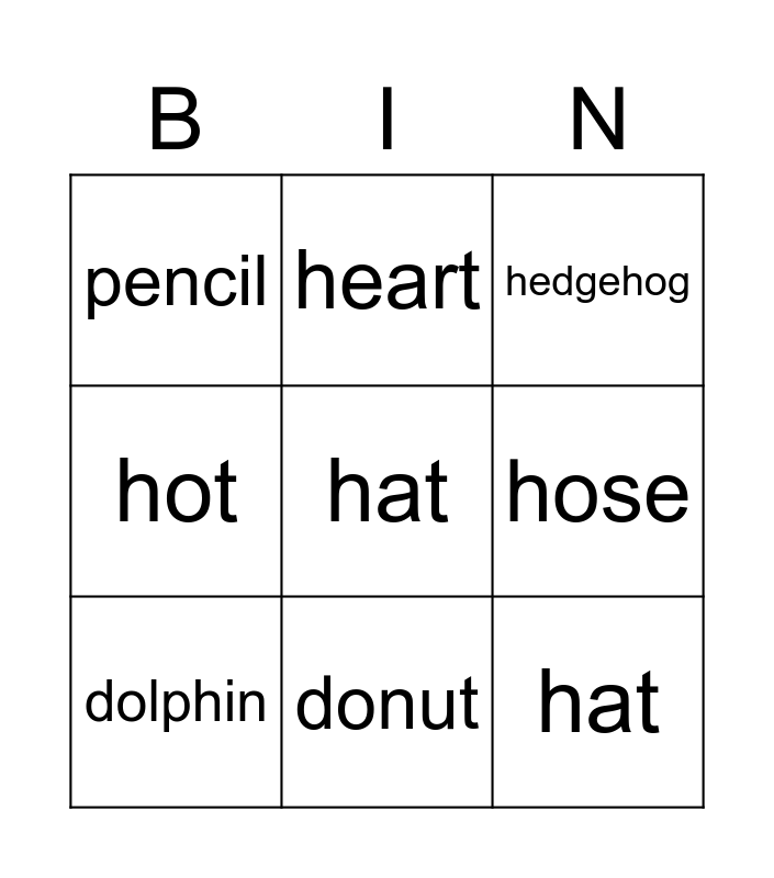 This bingo card has 28 words: hippo, hammer, hat, house, hose, hedgehog, heart, hot dog, horse, honey, helicopter, hot, apple, ant, avocado, alligator, dinosaur, dolphin, donut, duck, pencil, penguin, pizza, pumpkin, hippo, house, hat and hammer.
