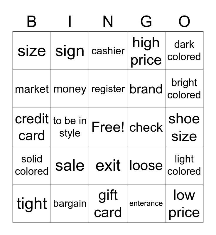 This bingo card has a free space and 24 words: sale, bargain, register, tight, dark colored, size, market, sign, check, exit, brand, credit card, loose, light colored, money, enterance, shoe size, cashier, bright colored, to be in style, low price, solid colored, high price and gift card.