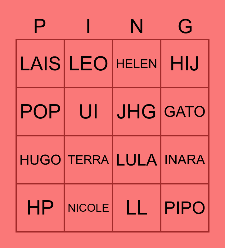 This bingo card has 16 words: NICOLE, INARA, HELEN, LAIS, HUGO, LEO, LULA, LL, POP, UI, HP, HIJ, TERRA, GATO, JHG and PIPO.