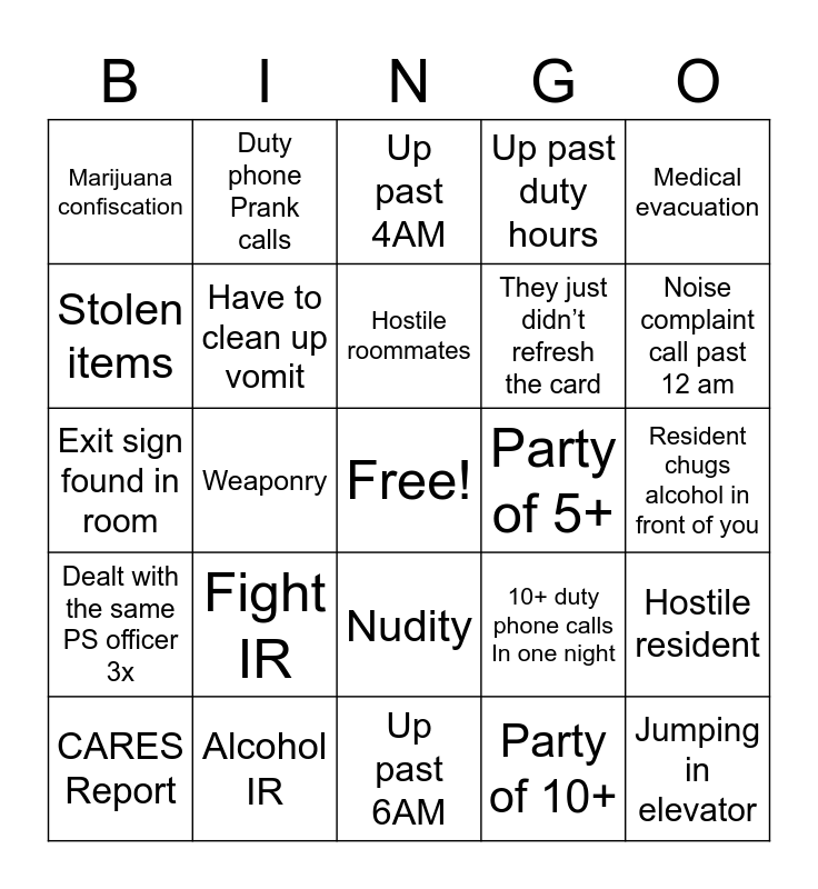 This bingo card has a free space and 24 words: Fight IR, Alcohol IR, Hostile roommates, CARES Report, Medical evacuation, Marijuana confiscation, Stolen items, Duty phone Prank calls, Party of 5+, Nudity, They just didn’t refresh the card, Exit sign found in room, 10+ duty phone calls In one night, Hostile resident, Have to clean up vomit, Party of 10+, Resident chugs alcohol in front of you, Up past 4AM, Noise complaint call past 12 am, Weaponry, Jumping in elevator, Dealt with the same PS officer 3x, Up past duty hours and Up past 6AM.