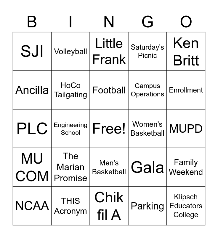 This bingo card has a free space and 24 words: The Marian Promise, THIS Acronym, Football, NCAA, Ken Britt, SJI, Ancilla, Volleyball, Women's Basketball, Men's Basketball, Campus Operations, PLC, Gala, Family Weekend, HoCo Tailgating, Parking, MUPD, Little Frank, Enrollment, Engineering School, Klipsch Educators College, MU COM, Saturday's Picnic and Chik fil A.