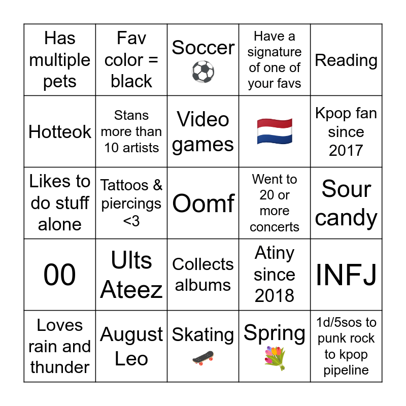 This bingo card has a free space and 24 words: Ults Ateez, August Leo, Video games, Loves rain and thunder, Reading, Has multiple pets, Hotteok, Fav color = black, Went to 20 or more concerts, Collects albums, 🇳🇱, Likes to do stuff alone, Atiny since 2018, INFJ, Stans more than 10 artists, Spring 💐, Sour candy, Soccer⚽️, Kpop fan since 2017, Tattoos & piercings <3, 1d/5sos to punk rock to kpop pipeline, 00, Have a signature of one of your favs and Skating 🛹.