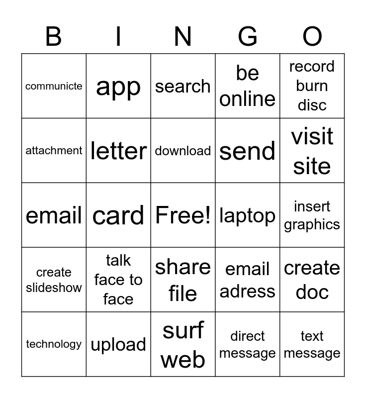 This bingo card has a free space and 24 words: talk face to face, upload, download, technology, record burn disc, communicte, attachment, app, laptop, share file, send, email, email adress, create doc, letter, direct message, insert graphics, search, visit site, card, text message, create slideshow, be online and surf web.