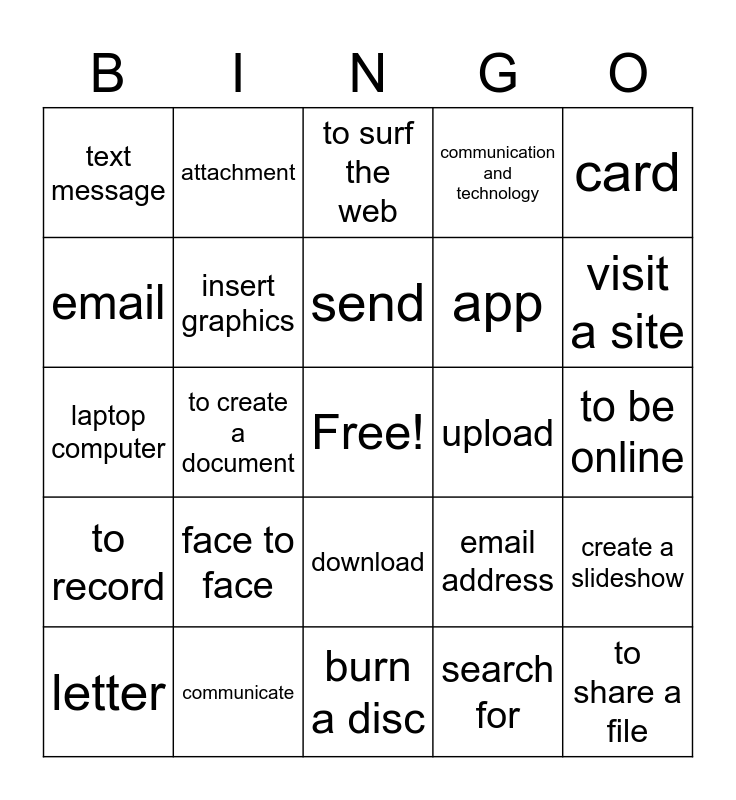 This bingo card has a free space and 24 words: face to face, communicate, send, letter, card, text message, email, attachment, upload, download, app, laptop computer, email address, create a slideshow, insert graphics, search for, to be online, to surf the web, visit a site, to create a document, to share a file, to record, communication and technology and burn a disc.