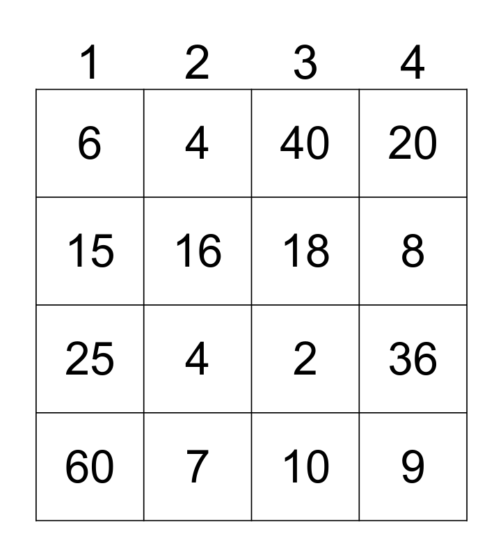 This bingo card has a free space and 15 words: 60, 9, 40, 6, 8, 15, 4, 10, 16, 25, 36, 20, 18, 4 and 7.