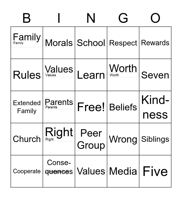 This bingo card has 6 images, a free space and 24 words: Right, Conse-quences, Learn, Cooperate, Rewards, Family, Rules, Morals, Beliefs, Peer Group, Worth, Extended Family, Wrong, Siblings, Values, Media, Kind-ness, School, Seven, Parents, Five, Church, Respect and Values.