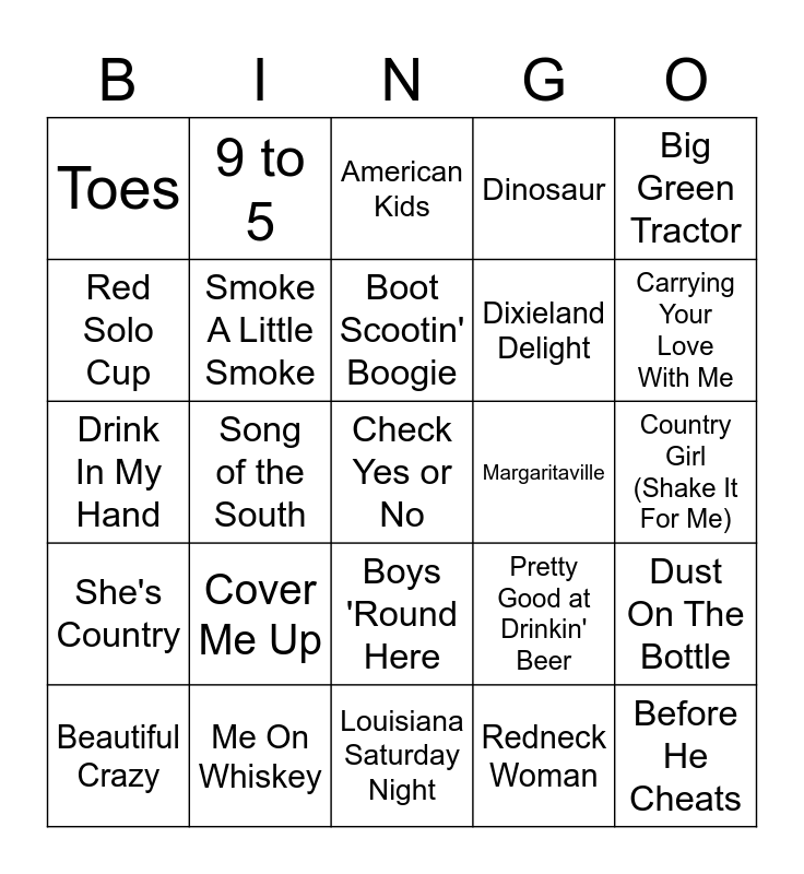 This bingo card has 55 words: Must Be Doin' Somethin' Right, Beautiful Crazy, Blue Ain't Your Color, Toes, Louisiana Saturday Night, Sweet Home Alabama, Smoke A Little Smoke, Friends in Low Places, Dixieland Delight, Red Dirt Road, Dinosaur, Neon Moon, Somebody's Problem, It's Five O'Clock Somewhere, Callin' Baton Rouge, It's A Great Day To Be Alive, Big Green Tractor, Song of the South, Courtesy Of The Red, White, and Blue, Check Yes or No, Margaritaville, Drunk On A Plane, Pretty Good at Drinkin' Beer, American Kids, One Margarita, Boot Scootin' Boogie, Redneck Woman, Save a Horse (Ride a Cowboy), Country Girl (Shake It For Me), Dust On The Bottle, Chattahoochee, She Thinks My Tractor's Sexy, Tequila Makes Her Clothes Fall Off, Beer Never Broke My Heart, Red Solo Cup, Drink In My Hand, Chicken Fried, She's Country, Before He Cheats, Honky Tonk Badonkadonk, 9 to 5, Jolene, Whiskey Glasses, Wasted On You, Cover Me Up, Me On Whiskey, Night Shift, There Was This Girl, This Bar, Carrying Your Love With Me, All-American Girl, REDNECKER, Cruise, Boys 'Round Here and Springsteen.