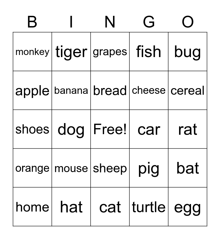 This bingo card has a free space and 24 words: mouse, hat, bread, home, bug, monkey, apple, tiger, car, sheep, cheese, shoes, pig, bat, banana, turtle, rat, grapes, cereal, dog, egg, orange, fish and cat.