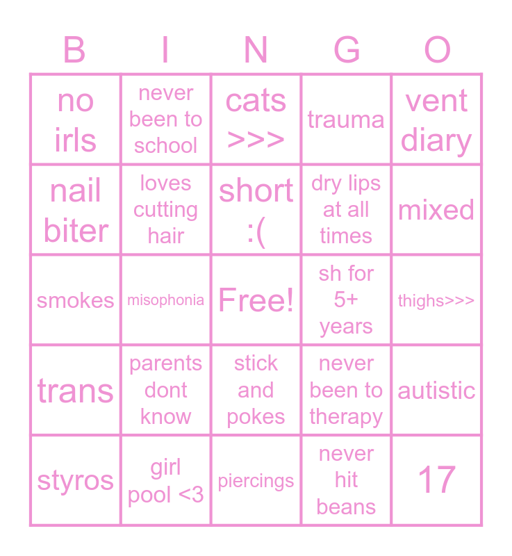 This bingo card has a free space and 24 words: styros, parents dont know, short :(, never hit beans, vent diary, no irls, never been to school, cats >>>, sh for 5+ years, thighs>>>, smokes, loves cutting hair, never been to therapy, autistic, nail biter, girl pool <3, piercings, trauma, mixed, trans, misophonia, stick and pokes, dry lips at all times and 17.