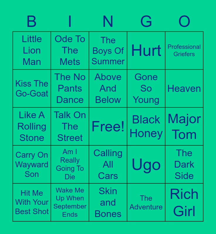 This bingo card has a free space and 50 words: Electric Feel, Rich Girl, Cardiac Arrest, Skin and Bones, Am I Really Going To Die, Dashboard, Ode To The Mets, Midnight Show, Kiss The Go-Goat, Mr. Fear, The No Pants Dance, Hurt, The Dark Side, Ugo, Let Me Down, Life Goes On, Above And Below, Black Honey, The Adventures Of Rain Dance Maggie, Professional Griefers, Talk On The Street, The Adventure, Little Lion Man, Gone So Young, Kings And Queens, Vindicated, Heaven, My Heroine, The Boys Of Summer, Calling All Cars, Paradise, Fireflies, Summer Of '69, Paradise City, Wake Me Up When September Ends, Two Princes, What's Up?, Go Your Own Way, Iris, Major Tom, One, Two Step, Buy U a Drank, Pony, I'll Be Missing You, Hit Me With Your Best Shot, Like A Rolling Stone, Take Me Home Tonight, Jumper, Carry On Wayward Son and The Longest Time.
