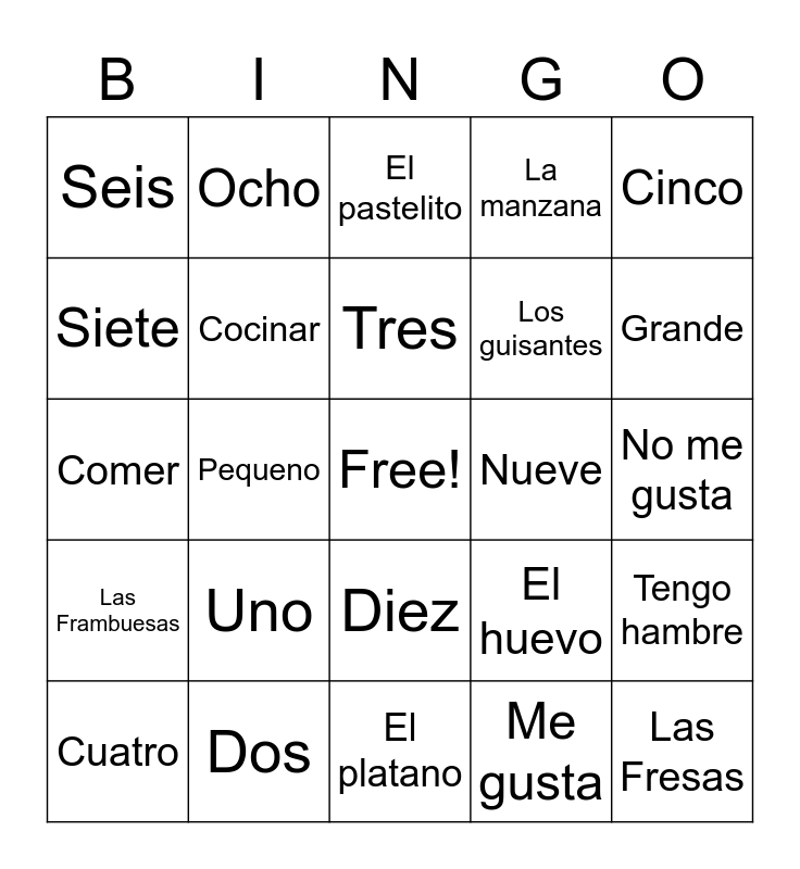 This bingo card has a free space and 24 words: Uno, Dos, Tres, Cuatro, Cinco, Seis, Siete, Ocho, Nueve, Diez, Los guisantes, Comer, El huevo, Tengo hambre, Cocinar, Me gusta, No me gusta, El pastelito, Grande, Pequeno, Las Fresas, Las Frambuesas, La manzana and El platano.