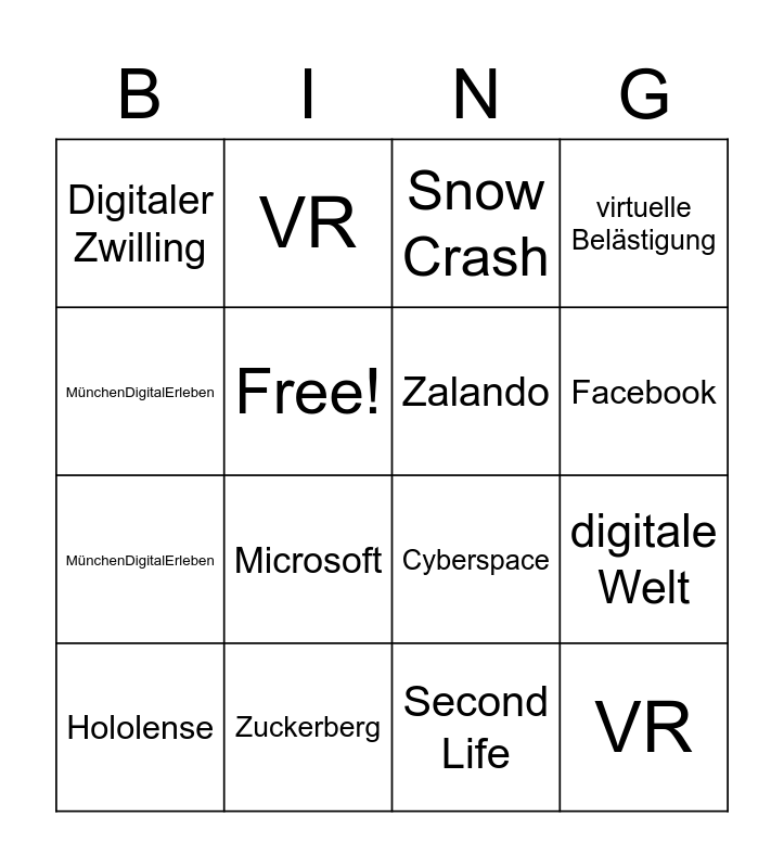 This bingo card has 23 words: VR, Hololense, Facebook, Microsoft, MünchenDigitalErleben, Digitaler Zwilling, Free!, VR, Hololense, Facebook, Microsoft, MünchenDigitalErleben, Digitaler Zwilling, Avatar, Zuckerberg, Epic, Snow Crash, Cyberspace, Zalando, digitale Welt, virtuelle Belästigung, Second Life and Reisen.