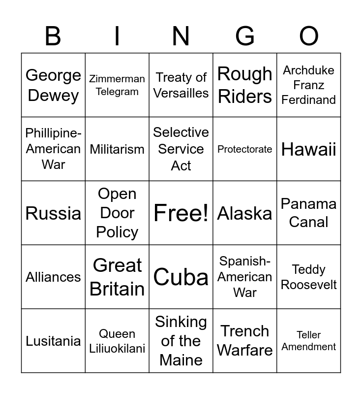 This bingo card has a free space and 34 words: Woodrow Wilson, Trench Warfare, Nationalism, Imperialism, Alliances, Militarism, Archduke Franz Ferdinand, Lusitania, Zimmerman Telegram, Neutrality, Selective Service Act, Treaty of Versailles, Germany, White Man's Burden, Alaska, Hawaii, Queen Liliuokilani, Russia, Great Britain, Spanish-American War, Cuba, Yellow Journalism, George Dewey, Panama Canal, Sinking of the Maine, Teller Amendment, Rough Riders, Platt Amendment, Protectorate, Phillipine-American War, Boxer Rebellion, Open Door Policy, Teddy Roosevelt and Dollar Diplomacy.