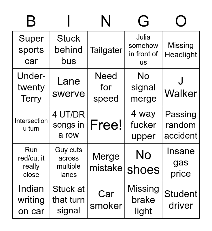 This bingo card has a free space and 24 words: Guy cuts across multiple lanes, Stuck at that turn signal, Need for speed, Indian writing on car, Missing Headlight, Super sports car, Under-twenty Terry, Stuck behind bus, 4 way fucker upper, Merge mistake, No signal merge, Intersection u turn, No shoes, Insane gas price, Lane swerve, Missing brake light, Passing random accident, Tailgater, J Walker, 4 UT/DR songs in a row, Student driver, Run red/cut it really close, Julia somehow in front of us and Car smoker.