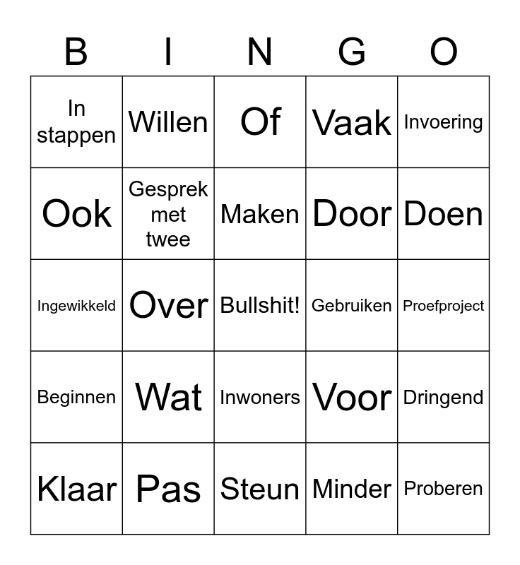 This bingo card has a free space and 24 words: Wat, Pas, Maken, Klaar, Invoering, In stappen, Ook, Willen, Gebruiken, Inwoners, Door, Ingewikkeld, Voor, Dringend, Gesprek met twee, Minder, Proefproject, Of, Doen, Over, Proberen, Beginnen, Vaak and Steun.