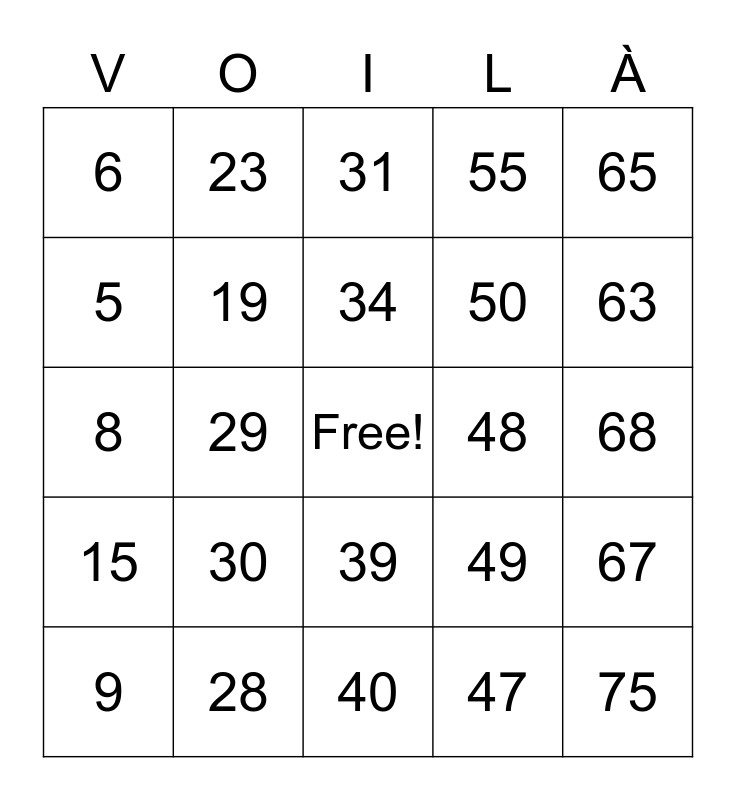 French Bingo, 1-75 Bingo Card