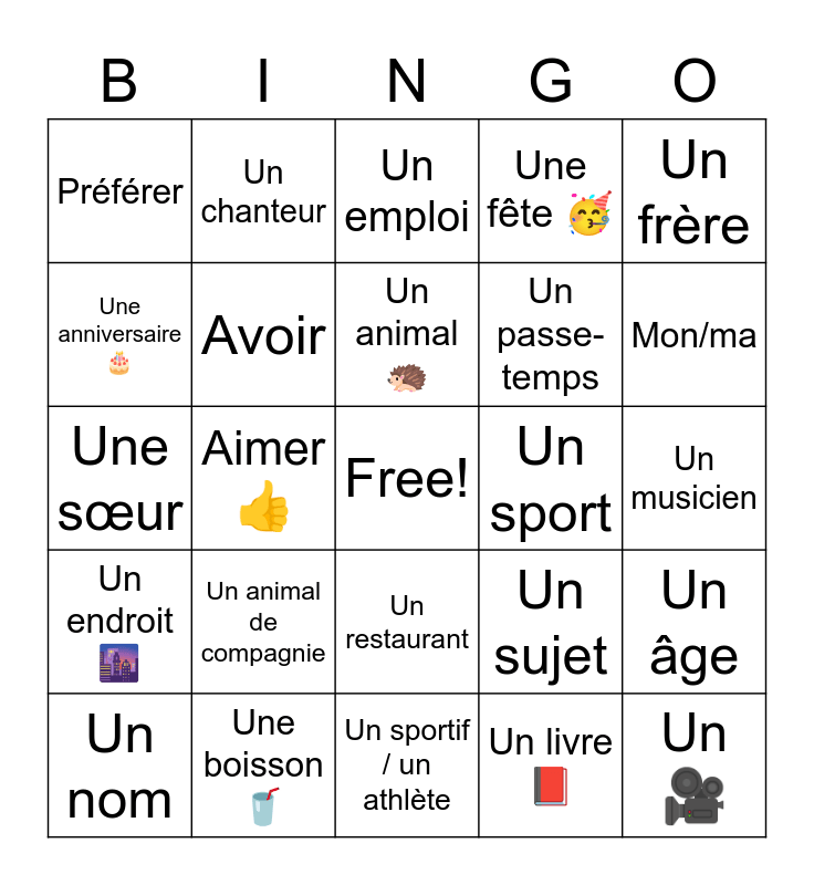 This bingo card has a free space and 30 words: Une boisson đ„€, Une collation đż, Aimer đ, PrĂ©fĂ©rĂ©, PrĂ©fĂ©rer, Un emploi, Avoir, Un restaurant, Un sport, Un sportif / un athlĂšte, Un musicien, Un đ„, Un livre đ, Quel/quelle, Mon/ma, Ton/ta, Un sujet, Un endroit đ, Un animal de compagnie, Un frĂšre, Une sĆur, Une chanson, Un chanteur, Un passe-temps, Une anniversaire đ, Une fĂȘte đ„ł, Un Ăąge, Un nom, Un animal đŠ and Free âïž.