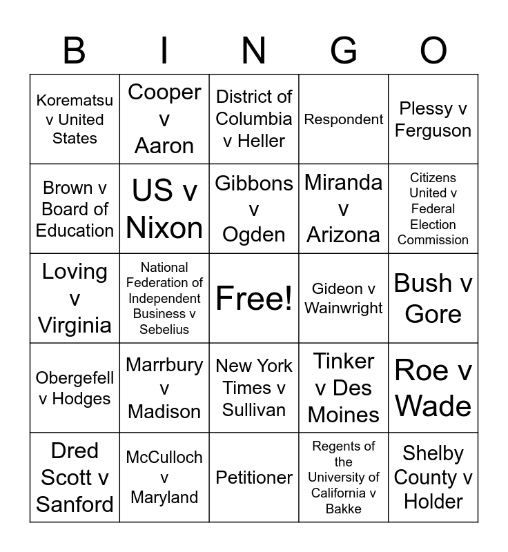 This bingo card has a free space and 24 words: Marrbury v Madison, McCulloch v Maryland, Gibbons v Ogden, Dred Scott v Sanford, Plessy v Ferguson, Korematsu v United States, Brown v Board of Education, Cooper v Aaron, Gideon v Wainwright, New York Times v Sullivan, Miranda v Arizona, Loving v Virginia, Tinker v Des Moines, Roe v Wade, US v Nixon, Regents of the University of California v Bakke, Bush v Gore, District of Columbia v Heller, Citizens United v Federal Election Commission, National Federation of Independent Business v Sebelius, Shelby County v Holder, Obergefell v Hodges, Respondent and Petitioner.