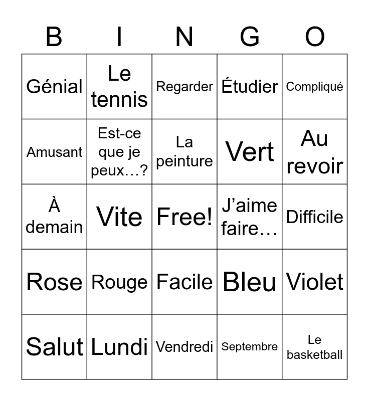 This bingo card has a free space and 68 words: Le vélo, Le basketball, Le foot, Les jeux vidéo, La lecture, La natation, Le tennis, La musique, La peinture, Le piano, Facile, Interessant, Difficile, Compliqué, Super, Amusant, Vite, Génial, Incroyable, Rouge, Vert, Bleu, Rose, Jaune, Blanc, Marron, Noir, Orange, Violet, Lire, Regarder, Danser, Jouer, Aimer, Étudier, Greetings, Bonjour, Salut, Au revoir, À demain, Bon weekend, Bonsoir, Est-ce que je peux…?, Est-ce que c’est…?, Est-ce que tu aimes…?, J’aime jouer…, J’aime…, Je n’aime pas…, J’aime faire…, Lundi, Mardi, Mercredi, Jeudi, Vendredi, Samedi, Dimanche, Septembre, Deux mille vingt-deux, Un, Deux, Trois, Quatre, Cinq, Six, Sept, Huit, Neuf and Dix.