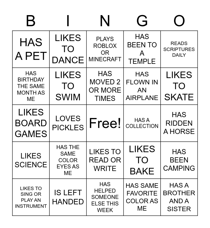 This bingo card has a free space and 24 words: HAS THE SAME COLOR EYES AS ME, IS LEFT HANDED, HAS MOVED 2 OR MORE TIMES, LIKES TO SING OR PLAY AN INSTRUMENT, READS SCRIPTURES DAILY, HAS A PET, HAS BIRTHDAY THE SAME MONTH AS ME, LIKES TO DANCE, HAS A COLLECTION, LIKES TO READ OR WRITE, HAS FLOWN IN AN AIRPLANE, LIKES BOARD GAMES, LIKES TO BAKE, HAS BEEN CAMPING, LIKES TO SWIM, HAS SAME FAVORITE COLOR AS ME, HAS RIDDEN A HORSE, PLAYS ROBLOX OR MINECRAFT, LIKES TO SKATE, LOVES PICKLES, HAS A BROTHER AND A SISTER, LIKES SCIENCE, HAS BEEN TO A TEMPLE and HAS HELPED SOMEONE ELSE THIS WEEK.