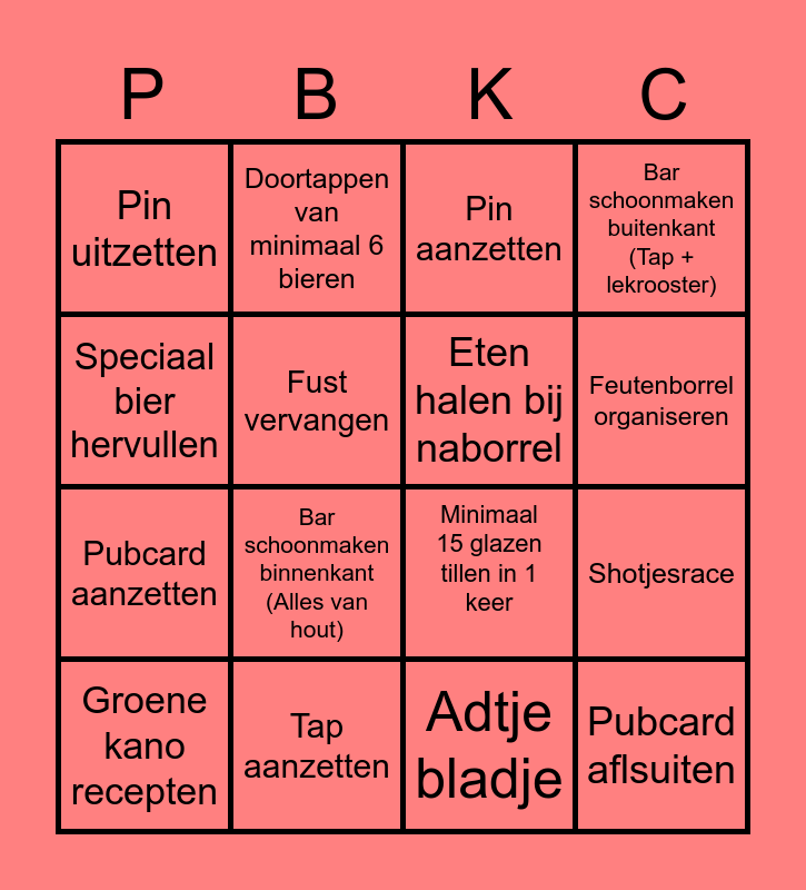This bingo card has 16 words: Tap aanzetten, Shotjesrace, Pin aanzetten, Pin uitzetten, Pubcard aanzetten, Doortappen van minimaal 6 bieren, Minimaal 15 glazen tillen in 1 keer, Adtje bladje, Speciaal bier hervullen, Fust vervangen, Groene kano recepten, Bar schoonmaken buitenkant (Tap + lekrooster), Bar schoonmaken binnenkant (Alles van hout), Feutenborrel organiseren, Eten halen bij naborrel and Pubcard aflsuiten.