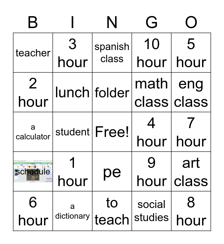 This bingo card has 1 images, a free space and 24 words: 1 hour, a dictionary, folder, 6 hour, 5 hour, teacher, 2 hour, 3 hour, 4 hour, pe, math class, a calculator, 9 hour, art class, lunch, social studies, 7 hour, spanish class, eng class, student, 8 hour, schedule, 10 hour and to teach.