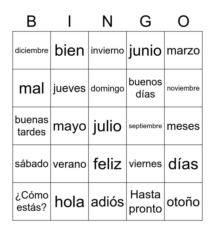 This bingo card has a free space and 36 words: lunes, martes, miércoles, jueves, viernes, sábado, domingo, enero, marzo, abril, mayo, junio, agosto, septiembre, noviembre, diciembre, primavera, verano, otoño, invierno, meses, días, hola, ¿Cómo estás?, adiós, bien, buenas tardes, ¿Cómo te llamas?, buenos días, mal, buenas noches, Hasta mañana, Hasta pronto, feliz, mas o menos and febrero.