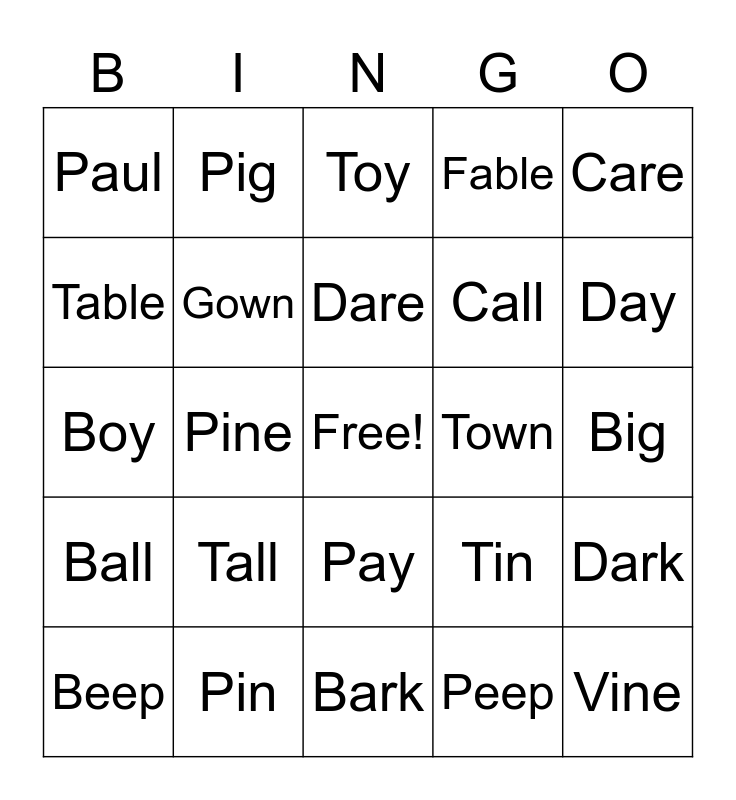 This bingo card has a free space and 24 words: Beep, Tall, Dare, Peep, Care, Paul, Pig, Toy, Town, Big, Boy, Gown, Tin, Dark, Table, Pin, Bark, Fable, Day, Ball, Pine, Pay, Call and Vine.
