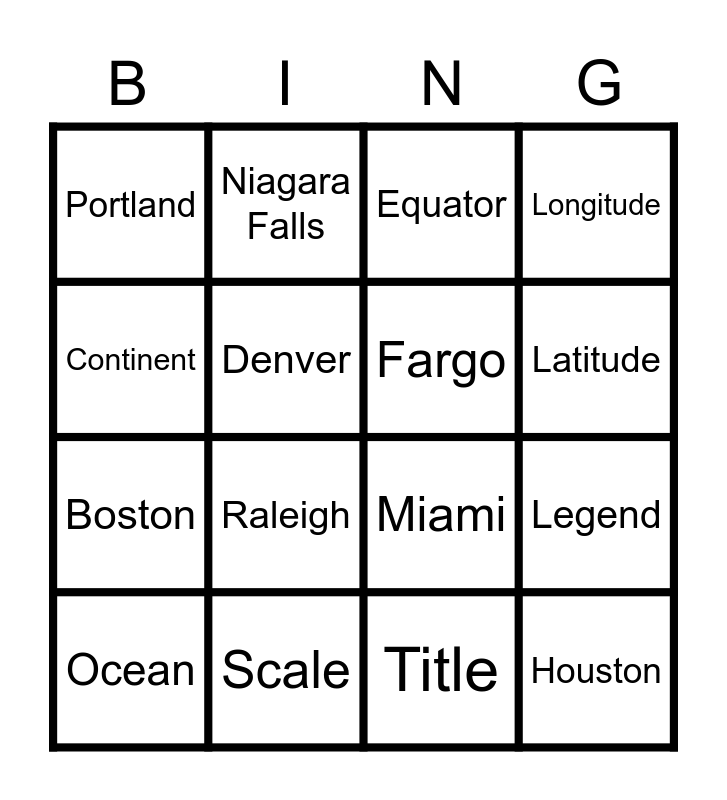 This bingo card has 20 words: Legend, Compass, Equator, Prime Meridian, Ocean, Continent, Scale, Portland, Boston, Niagara Falls, Raleigh, Miami, Denver, Houston, Fargo, Phoenix, Latitude, Longitude, Title and Symbol.