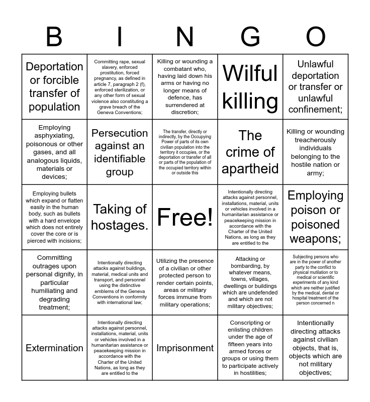 This bingo card has a free space and 56 words: Murder, Extermination, Enslavement, Deportation or forcible transfer of population, Imprisonment, Torture, Persecution against an identifiable group, Enforced disappearance of persons, The crime of apartheid, Other inhumane acts of a similar character intentionally causing great suffering, or serious injury to body or to mental or physical health, Wilful killing, Torture or inhuman treatment, including biological experiments;, Wilfully causing great suffering, or serious injury to body or health;, Extensive destruction and appropriation of property, not justified by military necessity and carried out unlawfully and wantonly;, Compelling a prisoner of war or other protected person to serve in the forces of a hostile Power;, Wilfully depriving a prisoner of war or other protected person of the rights of fair and regular trial;, Unlawful deportation or transfer or unlawful confinement;, Taking of hostages., Intentionally directing attacks against the civilian population as such or against individual civilians not taking direct part in hostilities;, Intentionally directing attacks against civilian objects, that is, objects which are not military objectives;, Intentionally directing attacks against personnel, installations, material, units or vehicles involved in a humanitarian assistance or peacekeeping mission in accordance with the Charter of the United Nations, as long as they are entitled to the, Intentionally launching an attack in the knowledge that such attack will cause incidental loss of life or injury to civilians or damage to civilian objects or widespread, long-term and severe damage to the natural environment which would be clear, Attacking or bombarding, by whatever means, towns, villages, dwellings or buildings which are undefended and which are not military objectives;, Killing or wounding a combatant who, having laid down his arms or having no longer means of defence, has surrendered at discretion;, Making improper use of a flag of truce, of the flag or of the military insignia and uniform of the enemy or of the United Nations, as well as of the distinctive emblems of the Geneva Conventions, resulting in death or serious personal injury;, The transfer, directly or indirectly, by the Occupying Power of parts of its own civilian population into the territory it occupies, or the deportation or transfer of all or parts of the population of the occupied territory within or outside this, Intentionally directing attacks against buildings dedicated to religion, education, art, science or charitable purposes, historic monuments, hospitals and places where the sick and wounded are collected, provided they are not military objectives;, Subjecting persons who are in the power of an adverse party to physical mutilation or to medical or scientific experiments of any kind which are neither justified by the medical, dental or hospital treatment of the person concerned nor carried ou, Killing or wounding treacherously individuals belonging to the hostile nation or army;, Declaring that no quarter will be given;, Destroying or seizing the enemy's property unless such destruction or seizure be imperatively demanded by the necessities of war;, Declaring abolished, suspended or inadmissible in a court of law the rights and actions of the nationals of the hostile party;, Compelling the nationals of the hostile party to take part in the operations of war directed against their own country, even if they were in the belligerent's service before the commencement of the war;, Pillaging a town or place, even when taken by assault;, Employing poison or poisoned weapons;, Employing asphyxiating, poisonous or other gases, and all analogous liquids, materials or devices;, Employing bullets which expand or flatten easily in the human body, such as bullets with a hard envelope which does not entirely cover the core or is pierced with incisions;, Employing weapons, projectiles and material and methods of warfare which are of a nature to cause superfluous injury or unnecessary suffering or which are inherently indiscriminate in violation of the international law of armed conflict, provided, Committing outrages upon personal dignity, in particular humiliating and degrading treatment;, Committing rape, sexual slavery, enforced prostitution, forced pregnancy, as defined in article 7, paragraph 2 (f), enforced sterilization, or any other form of sexual violence also constituting a grave breach of the Geneva Conventions;, Utilizing the presence of a civilian or other protected person to render certain points, areas or military forces immune from military operations;, Intentionally directing attacks against buildings, material, medical units and transport, and personnel using the distinctive emblems of the Geneva Conventions in conformity with international law;, Intentionally using starvation of civilians as a method of warfare by depriving them of objects indispensable to their survival, including wilfully impeding relief supplies as provided for under the Geneva Conventions;, Conscripting or enlisting children under the age of fifteen years into the national armed forces or using them to participate actively in hostilities., Intentionally directing attacks against the civilian population as such or against individual civilians not taking direct part in hostilities;, Intentionally directing attacks against buildings, material, medical units and transport, and personnel using the distinctive emblems of the Geneva Conventions in conformity with international law;, Intentionally directing attacks against personnel, installations, material, units or vehicles involved in a humanitarian assistance or peacekeeping mission in accordance with the Charter of the United Nations, as long as they are entitled to the, Intentionally directing attacks against buildings dedicated to religion, education, art, science or charitable purposes, historic monuments, hospitals and places wher