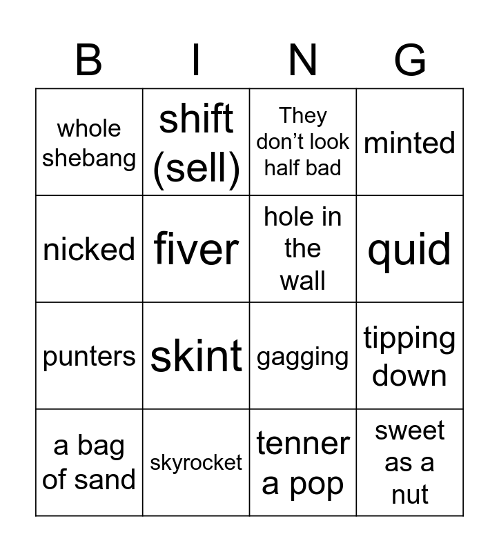 This bingo card has 26 words: Free!, top-notch, quid, la-di-da (posh), nicked, whole shebang, fiver, shift (sell), tenner a pop, raining cats and dogs, punters, gagging, chuck, tenner, tipping down, I’ll rake it in, minted, sweet as a nut, They don’t look half bad, a bag of sand, skint, bookies, skyrocket, sniffed this out, hole in the wall and wad.