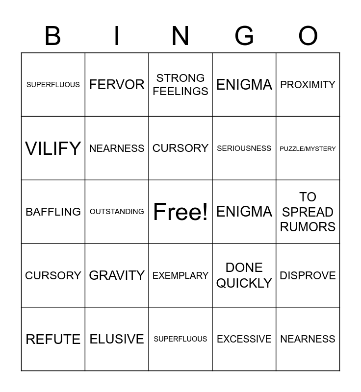 This bingo card has a free space and 24 words: GRAVITY, ELUSIVE, CURSORY, REFUTE, PROXIMITY, SUPERFLUOUS, VILIFY, FERVOR, ENIGMA, EXEMPLARY, SERIOUSNESS, BAFFLING, DONE QUICKLY, DISPROVE, NEARNESS, EXCESSIVE, TO SPREAD RUMORS, STRONG FEELINGS, PUZZLE/MYSTERY, OUTSTANDING, NEARNESS, CURSORY, ENIGMA and SUPERFLUOUS.